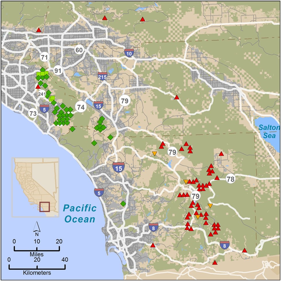 Where this study’s pumas were located, with each color representing a distinct genetic group. (Photo: Ernest et al.)Human development and highways — Interstate 15, in particular — have severed the ties these cougars had with their other California neighbors, the scientists say. "The genetic samples give us a clear indication that there was a genetic bottleneck in the last 80 or so years," says Holly Ernest, a study author and genetic expert at U.C. Davis, in a statement. "That tells us it's not just natural factors causing this loss of genetic diversity. It's us — people — impacting these environments."