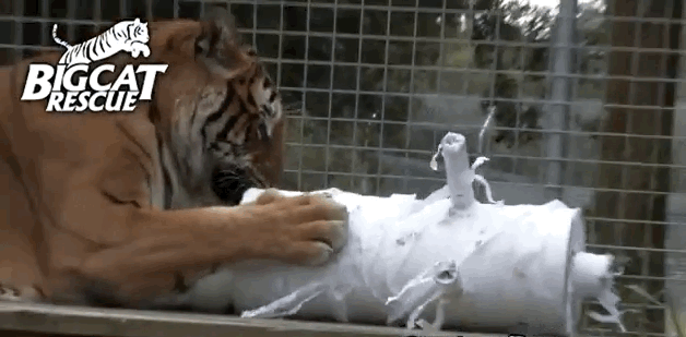 ... But he soon find that the toilet-paper mummy makes an excellent wrestling partner. Until, of course, Bengali gets a bit too playful and knocks his toy to the ground.